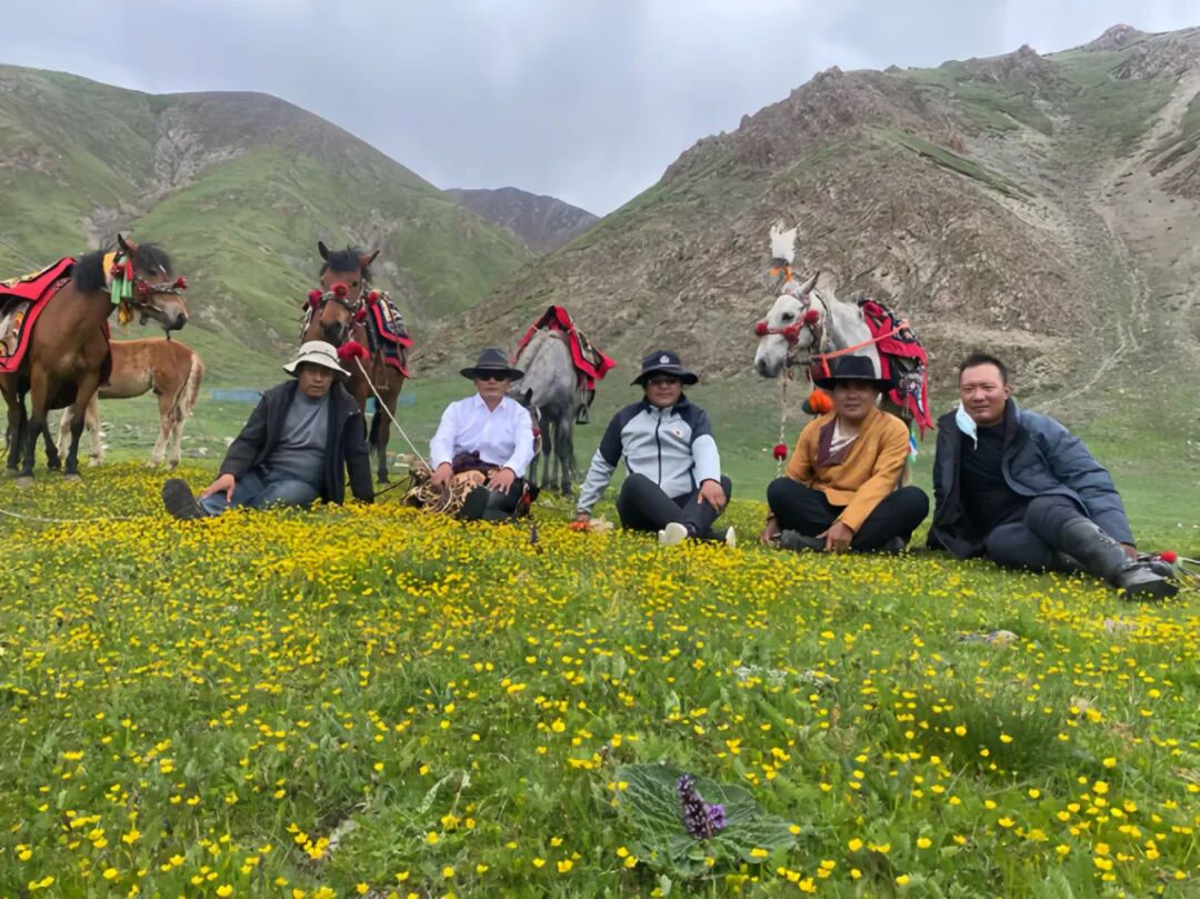 考日仁青才仁(中)与乡亲们在草原合影。青海省文明办供稿