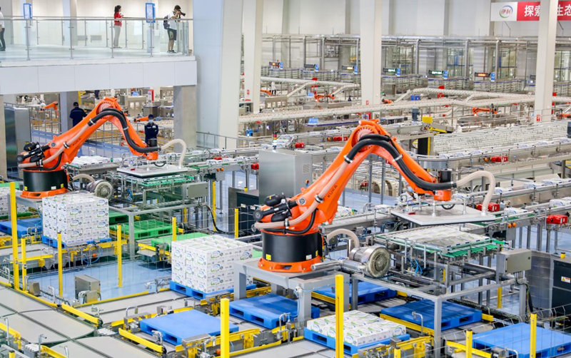 伊利液态奶全球智造标杆基地包装生产线采用新一代库卡机械手(7月16日摄)。(地方媒体供图)