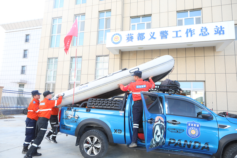 葵都义警救援队队员们正在将水域救援所用装备装车。