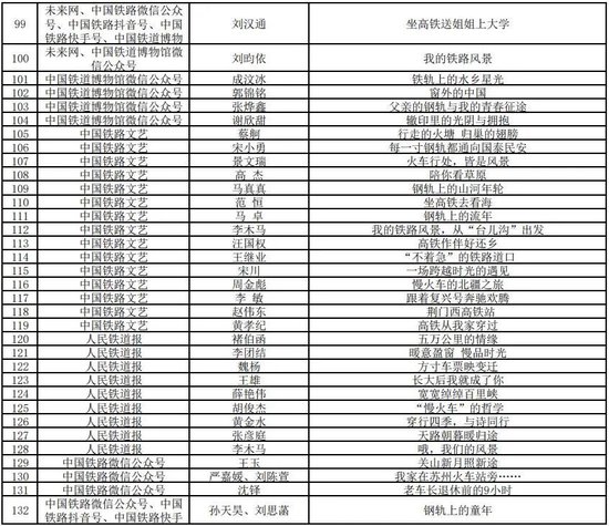 打印:12月30日,由中宣部文明创建局、中央网信办网络传播局、中国作协创联部、中国国家铁路集团有限公司党组宣传部联合举办的“我的铁路风景”故事汇原创美文征集展示活动优秀作品名单公布,共252件。